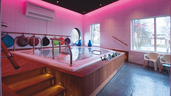 Relaxpaket: handduk, tofflor, badrock.